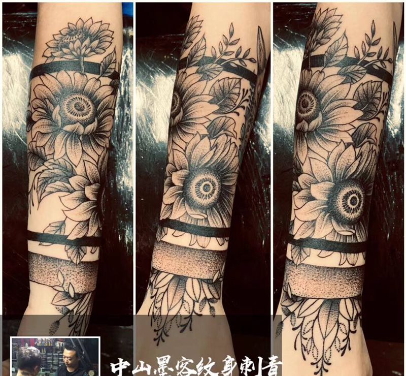 素花包臂纹身图片_手臂点刺纹身图案