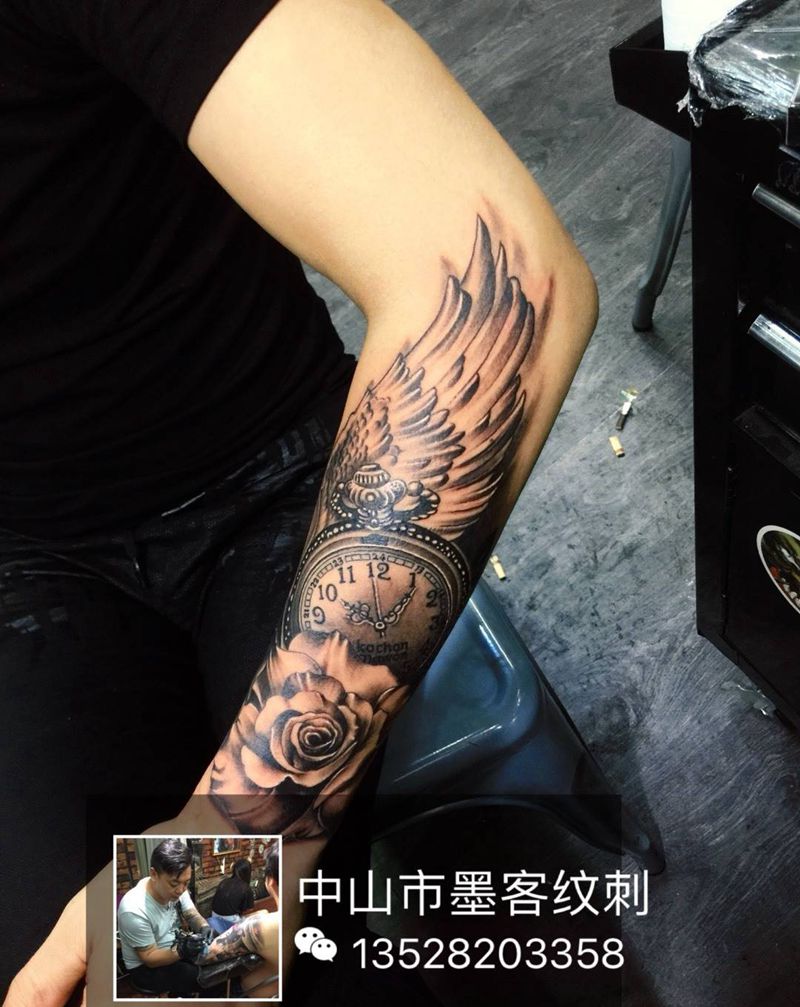当前位置: 首页 >广东省中山市纹身店-墨客纹身刺青纹身图案>欧美黑灰翅膀、怀表、玫瑰花纹身图片