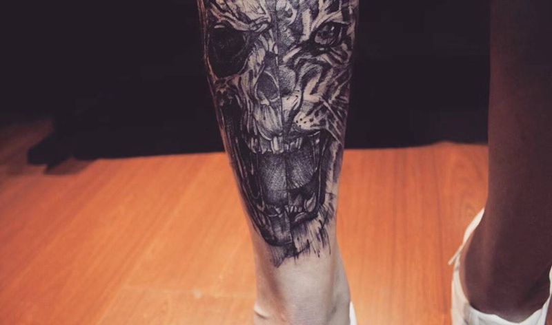 • T网红王老大花腿龙纹身图片_腿部新传统纹身图案