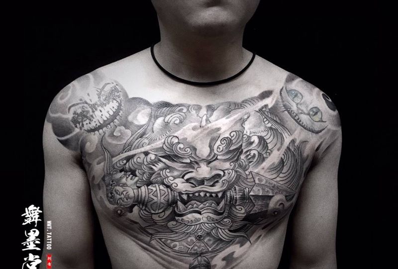 当前位置: 首页 >广东省潮州市纹身店-舞墨堂刺青纹身图案>唐狮 花胸纹身图片