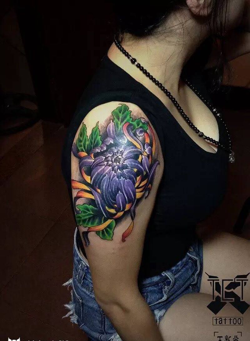 当前位置: 首页 >广东省潮州市纹身店-天刺堂纹身纹身图案>菊花纹身图片_成品肩部传统植物纹身图案