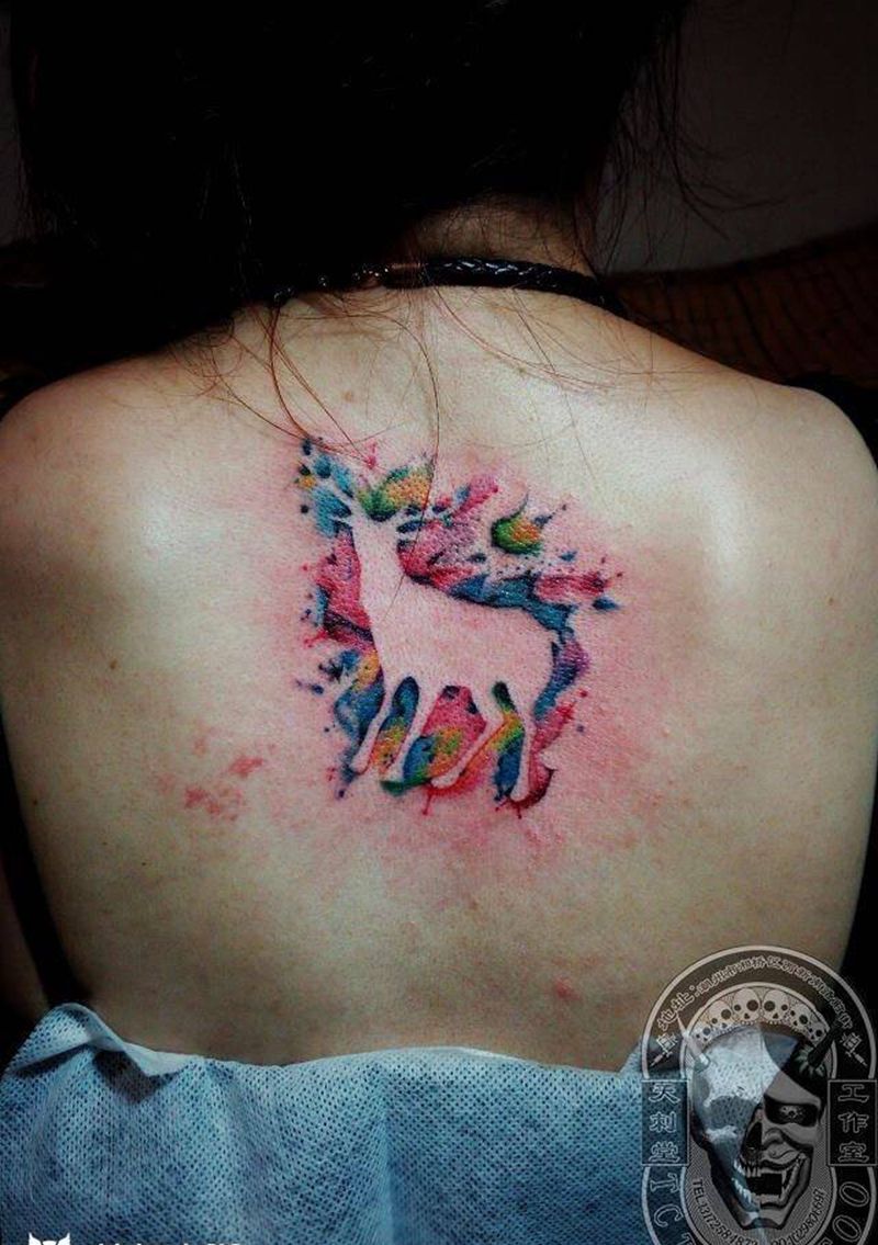 当前位置: 首页 >广东省潮州市纹身店-天刺堂纹身纹身图案>水彩纹身图片_成品背部清新动物纹身图案