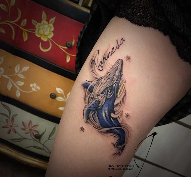 当前位置: 首页 >广东省中山市纹身店-紋藝閣纹身图案>鲸鱼纹身图片_腿部脚部水彩纹身图案