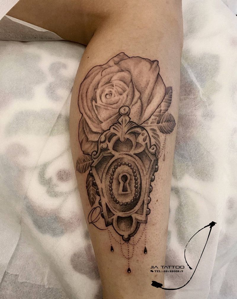 锁纹身图片_腿部脚部欧美写实点刺纹身图案