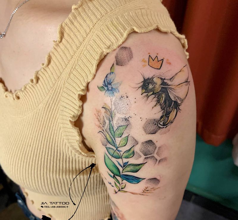 蜜蜂纹身图片_肩部臀部水彩纹身图案