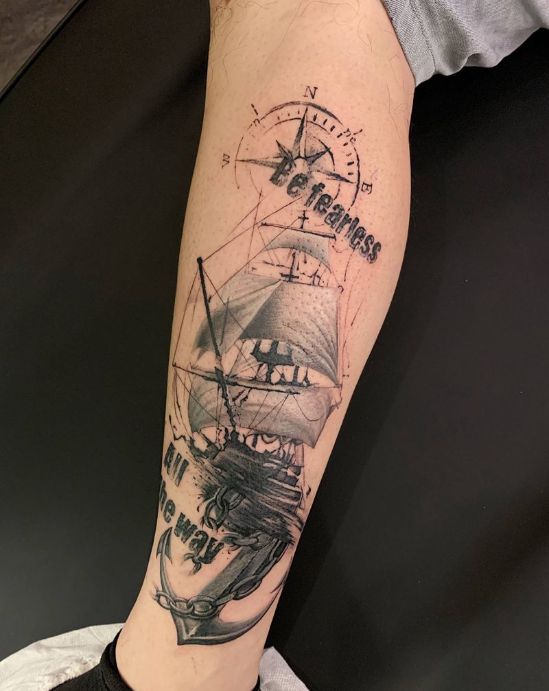 帆船遮盖纹身图片_腿部脚部水墨水彩纹身图案