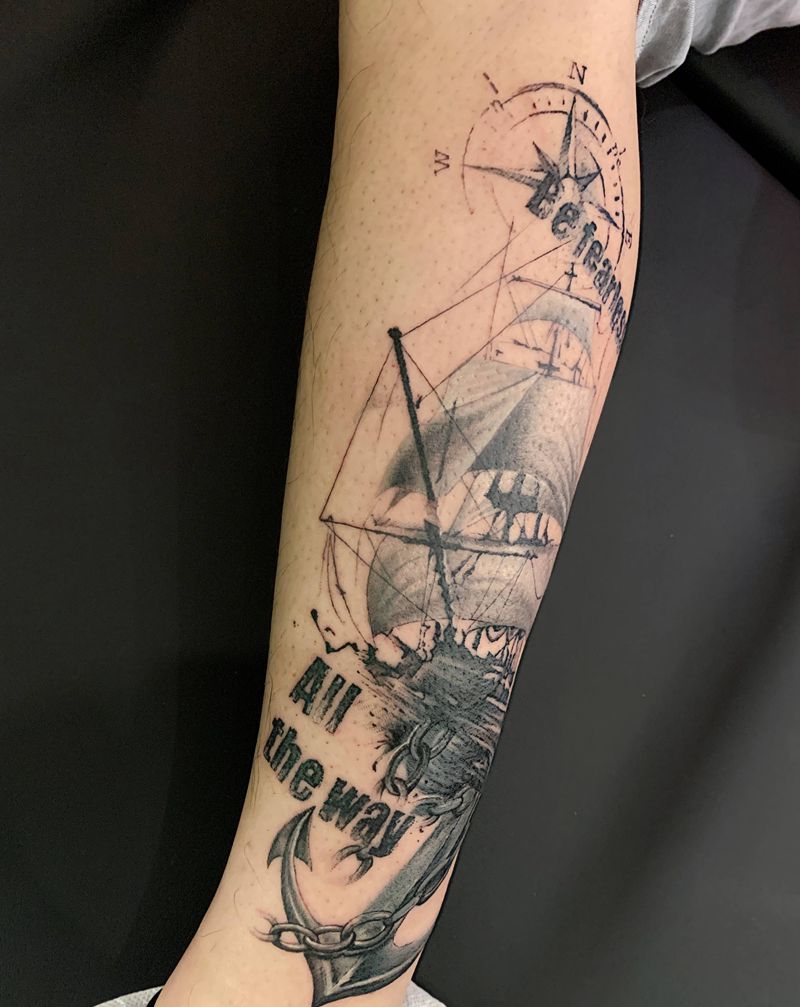 帆船遮盖纹身图片_腿部脚部水墨水彩纹身图案