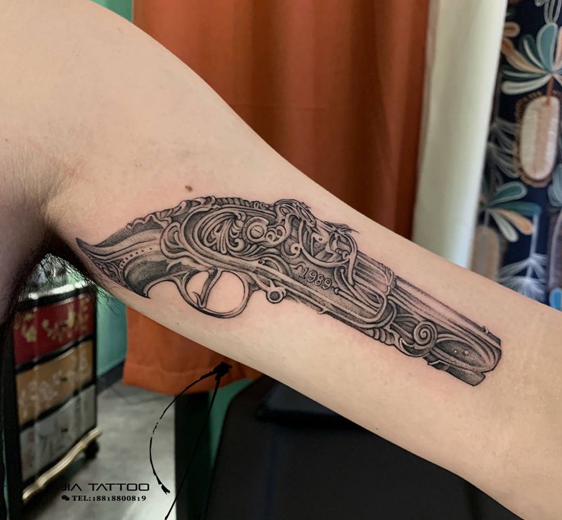 当前位置: 首页 >广东省中山市纹身店-紋藝閣纹身图案>枪纹身图片_手臂手部欧美写实纹身图案