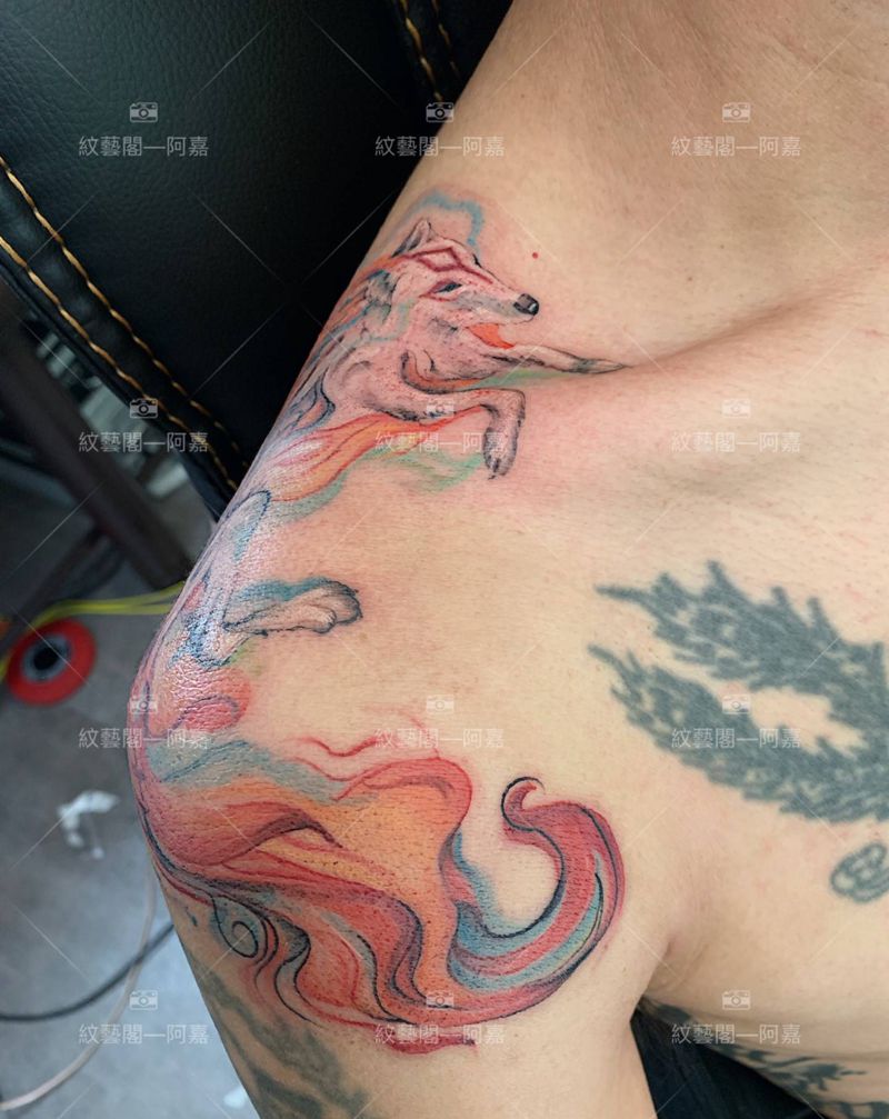 当前位置: 首页 >广东省中山市纹身店-紋藝閣纹身图案>肩上的白狐纹身图片_颈部水彩纹身图案