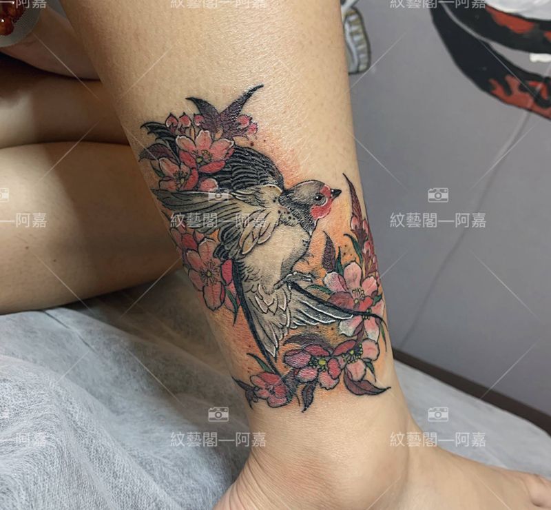燕子、遮盖纹身图片_腿部脚部水彩纹身图案