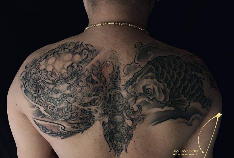 当前位置: 首页 >广东省中山市纹身店-紋藝閣纹身图案>半背唐狮鲤鱼纹身图片_背部肩部新传统老传统纹身图案