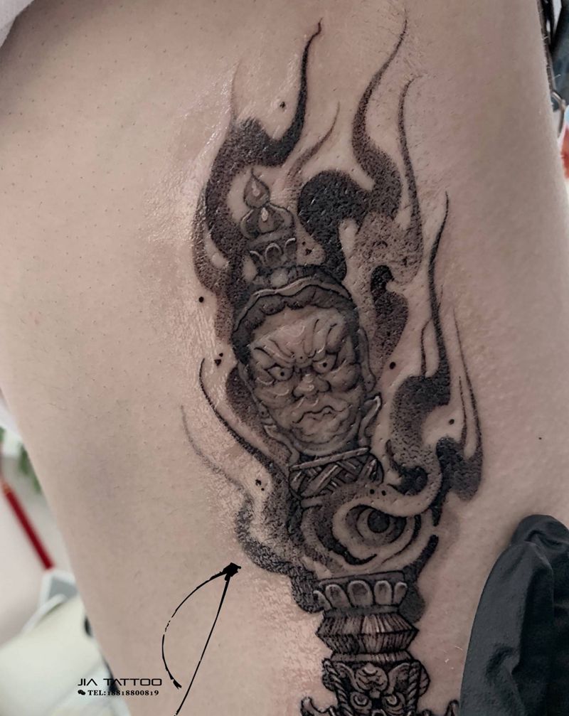 当前位置: 首页 >广东省中山市纹身店-紋藝閣纹身图案>降魔杵纹身图片_腹部腰部点刺新传统纹身图案