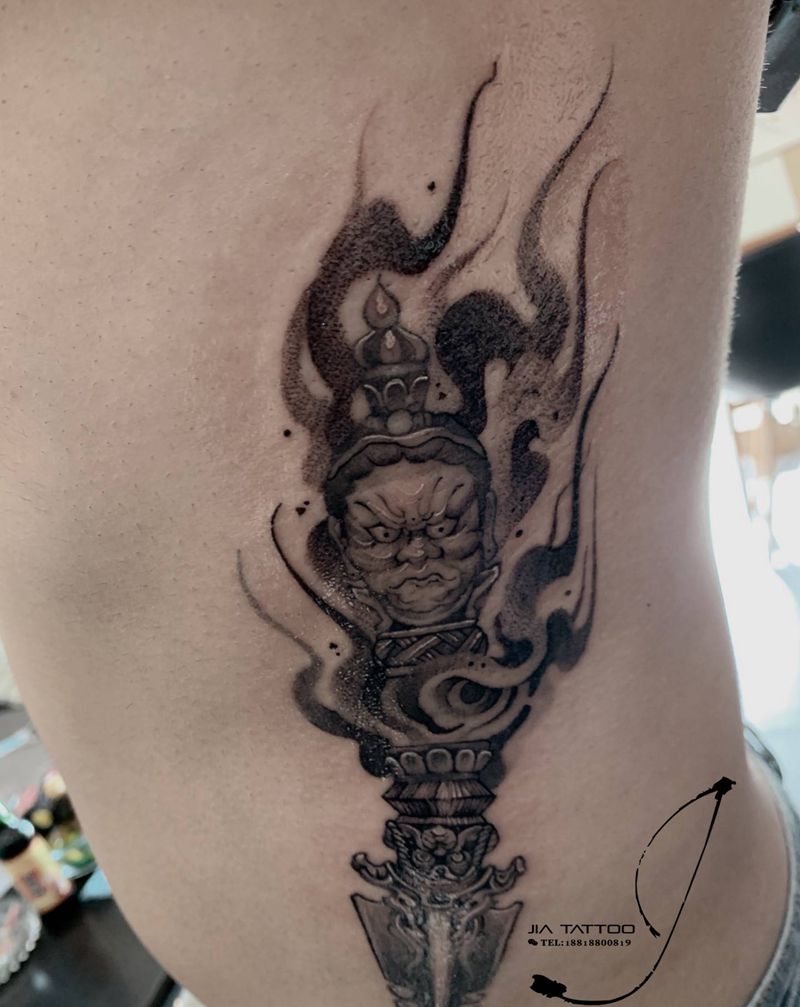 当前位置: 首页 >广东省中山市纹身店-紋藝閣纹身图案>降魔杵纹身图片_腹部腰部点刺新传统纹身图案