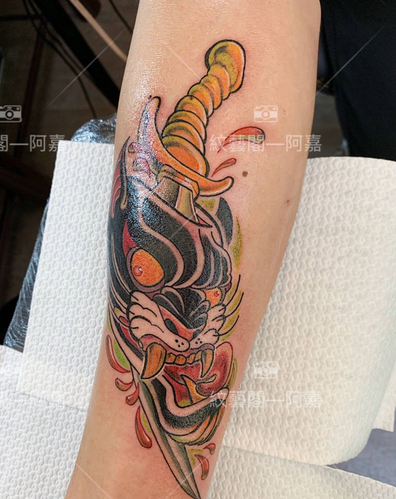 • T包小腿吹火男+阿多福纹身图片_腿部老传统新传统吹火男阿