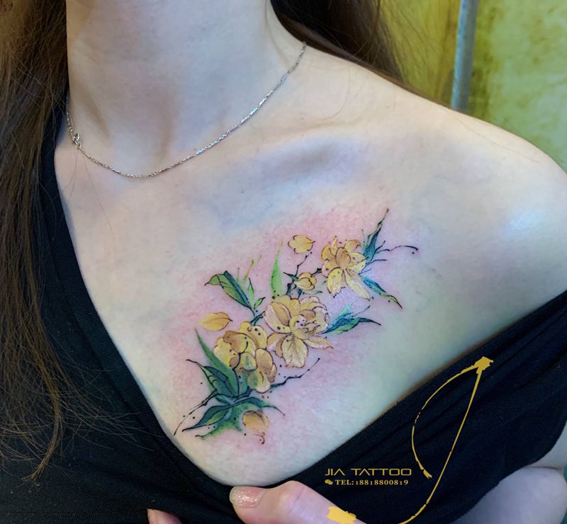 遮盖纹身图片_胸部肩部水彩水墨纹身图案