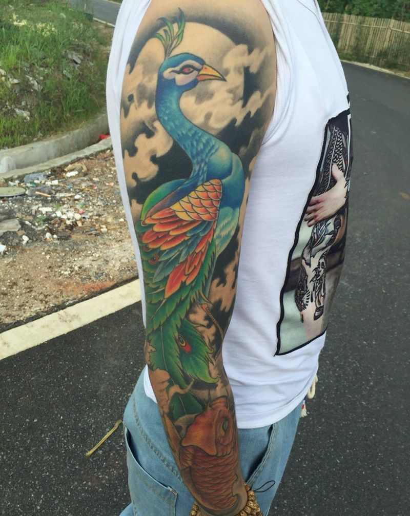 当前位置: 首页 >广东省揭阳市纹身店-揭阳韩艺堂纹身旗舰店纹身图案>孔雀鲤鱼纹身图片_成品手臂传统动物纹身图案