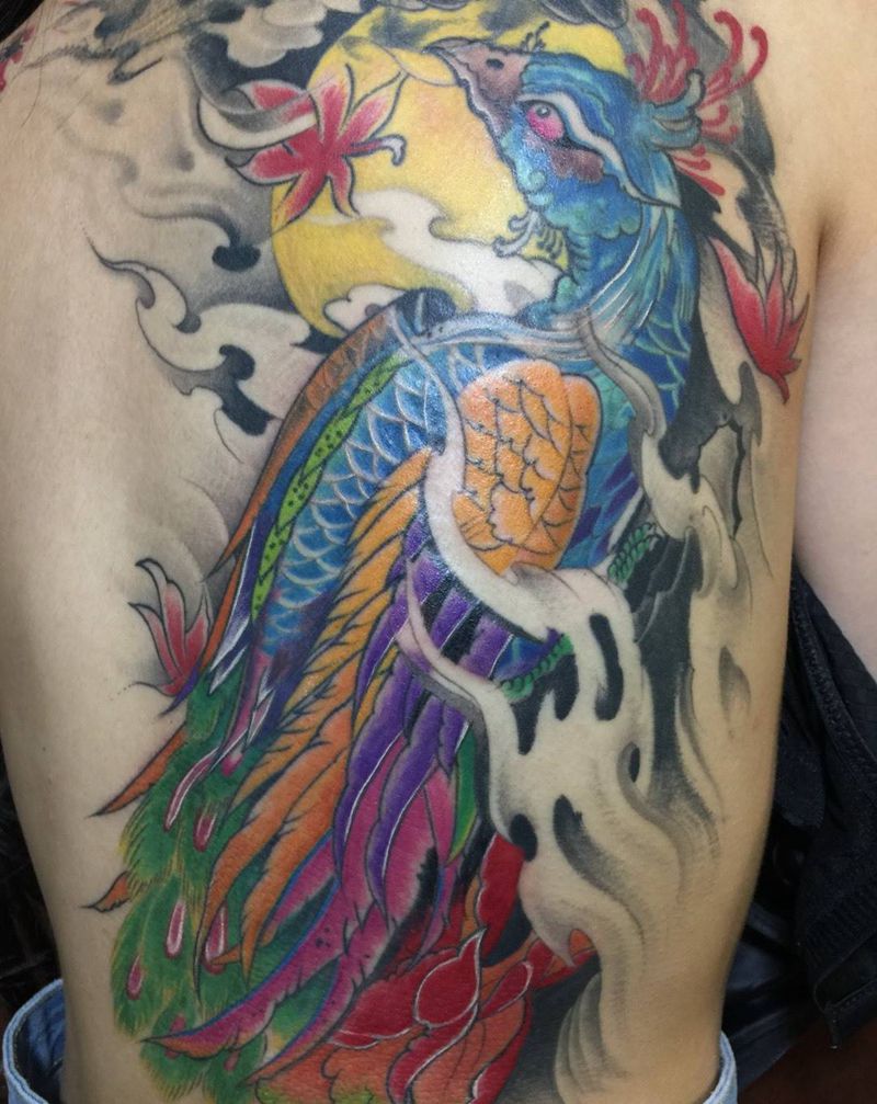 当前位置: 首页 >广东省揭阳市纹身店-揭阳韩艺堂纹身旗舰店纹身图案>孔雀。纹身图片_成品传统肩部背部纹身图案