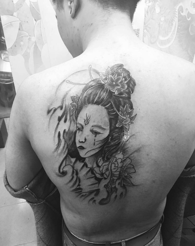 当前位置: 首页 >广东省揭阳市纹身店-恩刺青纹身纹身图案>艺妓纹身图片_成品背部传统人物纹身图案