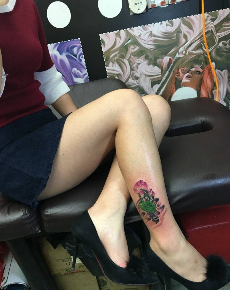 当前位置: 首页 >广东省揭阳市纹身店-恩刺青纹身纹身图案>手绘荷花遮盖旧图纹身图片_成品腿部清新传统植物原创纹身图案