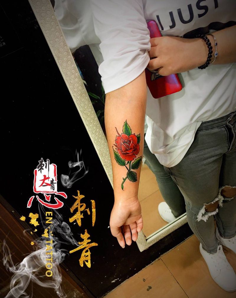 当前位置: 首页 >广东省揭阳市纹身店-恩刺青纹身纹身图案>玫瑰花纹身图片_手臂New School纹身图案