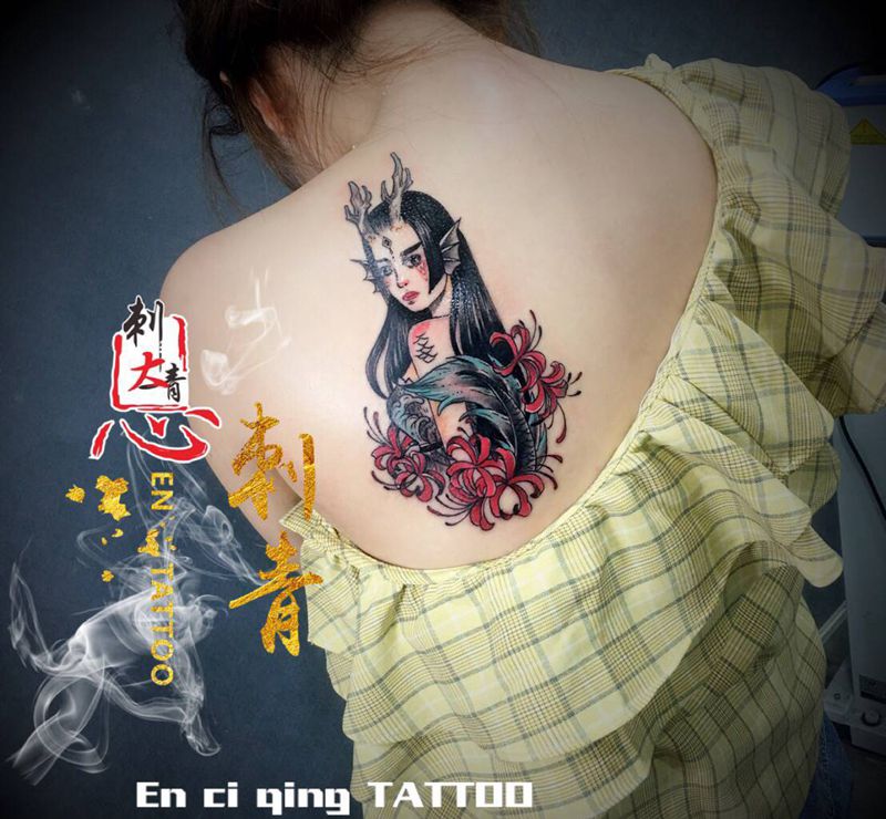 龙女纹身图片_肩部背部新传统水彩纹身图案