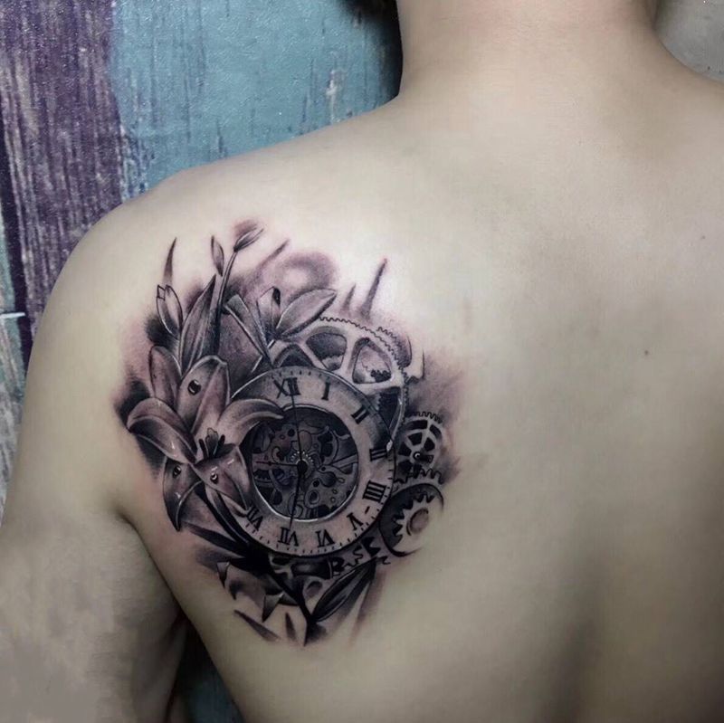 当前位置: 首页 >广东省揭阳市纹身店-揭阳韩艺堂纹身旗舰店纹身图案>时钟纹身图片_成品背部欧美写实原创静物纹身图案