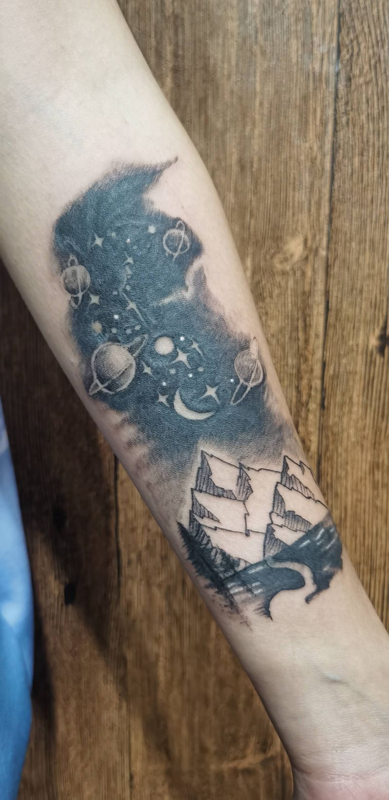 当前位置: 首页 >广西南宁市纹身店-上高铺31号文身馆纹身图案>遮盖星空纹身图片_手臂手部纹身图案