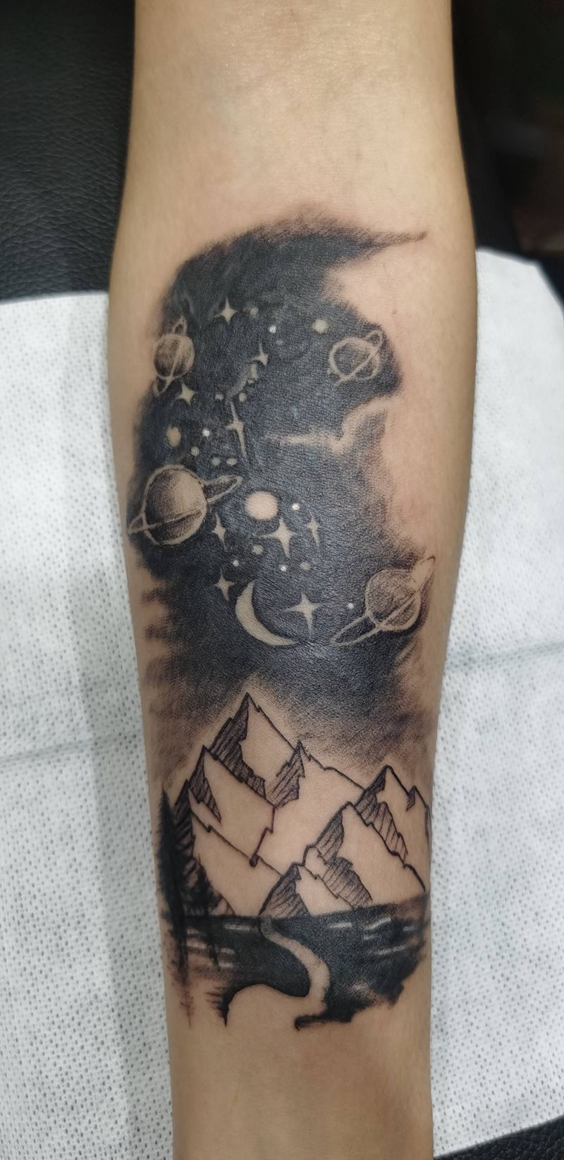当前位置: 首页 >广西南宁市纹身店-上高铺31号文身馆纹身图案>遮盖星空纹身图片_手臂手部纹身图案