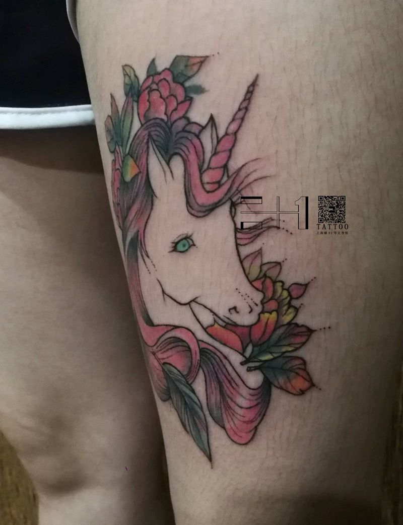 独角兽纹身图片_腿部习俗清新写实动物成品纹身图案