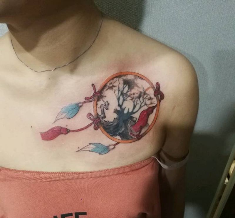 捕梦网式小传统纹身图片_胸部肩部新传统纹身图案