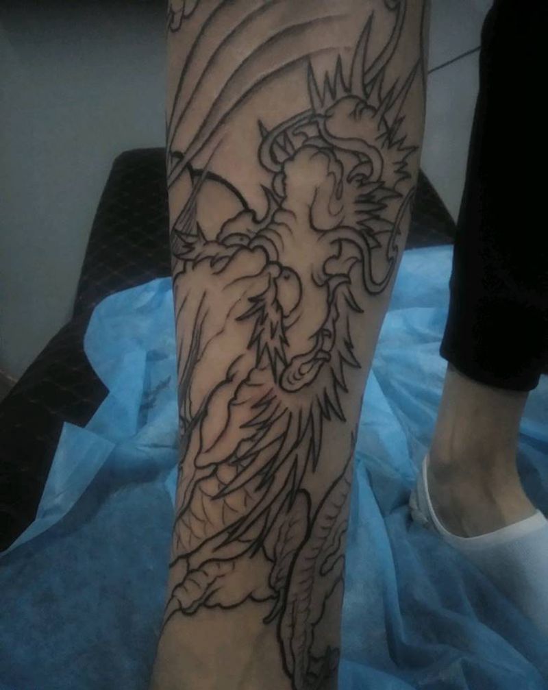 • T网红王老大花腿龙纹身图片_腿部新传统纹身图案