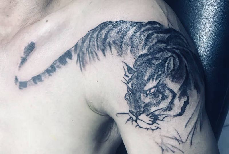 二虎哥纹身图片_胸部肩部水墨纹身图案
