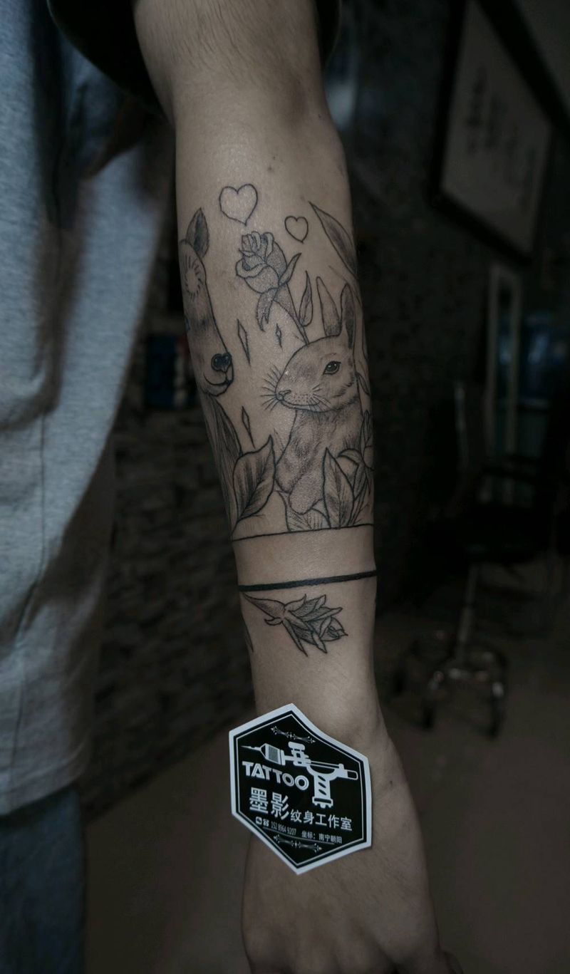 当前位置: 首页 >广西南宁市纹身店-南宁墨影刺青工作室纹身图案>素花羊+兔纹身图片_手臂手部点刺几何纹身图案