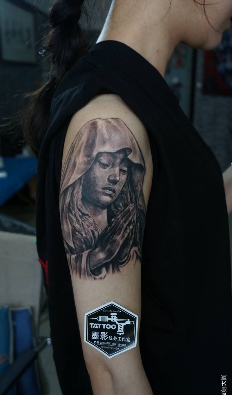 当前位置: 首页 >广西南宁市纹身店-南宁墨影刺青工作室纹身图案>圣母纹身图片_手部手臂欧美写实New School纹身图案