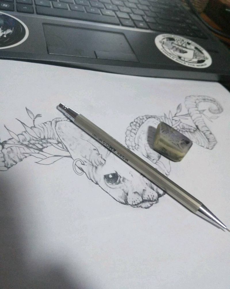 当前位置: 首页 >广西南宁市纹身店-南宁墨影刺青工作室纹身图案>长角的猫纹身图片