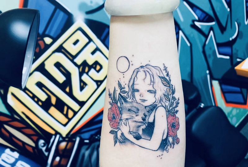 当前位置: 首页 >广西南宁市纹身店-72号刺青馆纹身图案>插画女孩纹身图片_手臂插画风纹身图案