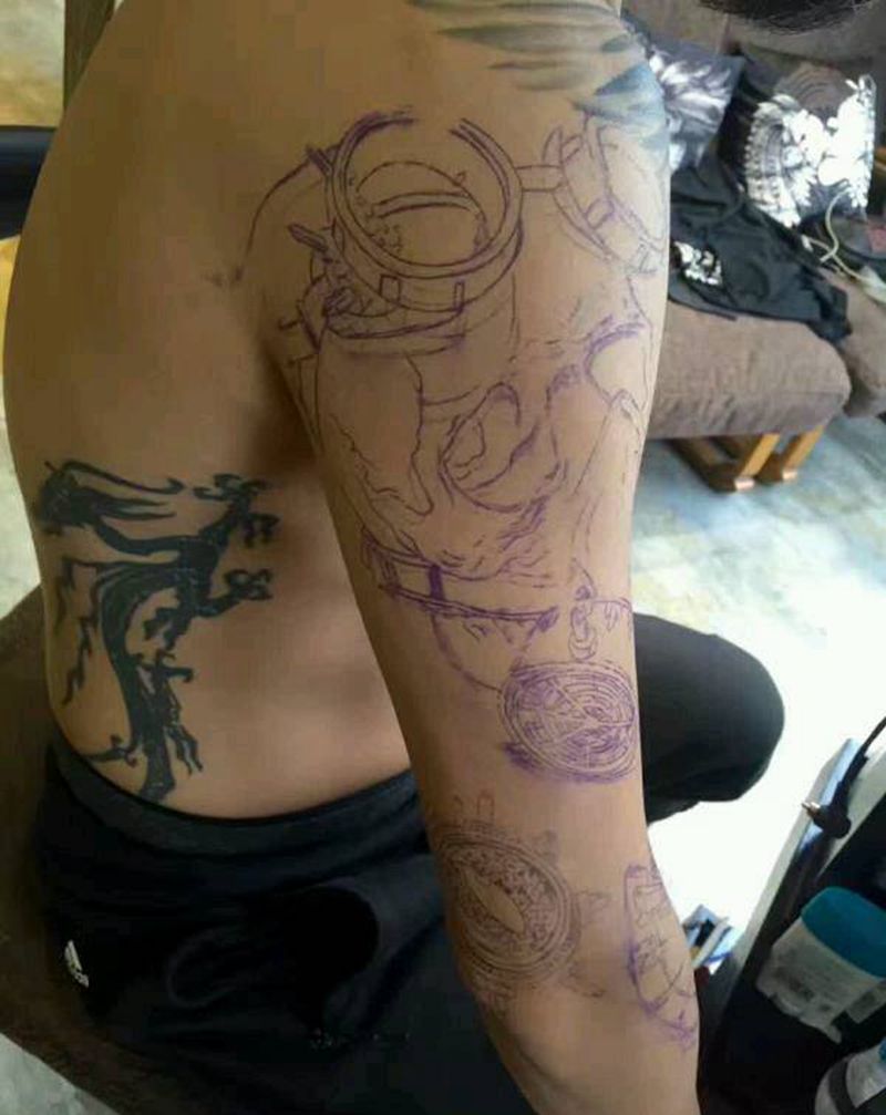 当前位置: 首页 >广西南宁市纹身店-墨匠刺青纹身图案>蒸汽朋克纹身图片_手臂传统鬼神成品纹身图案