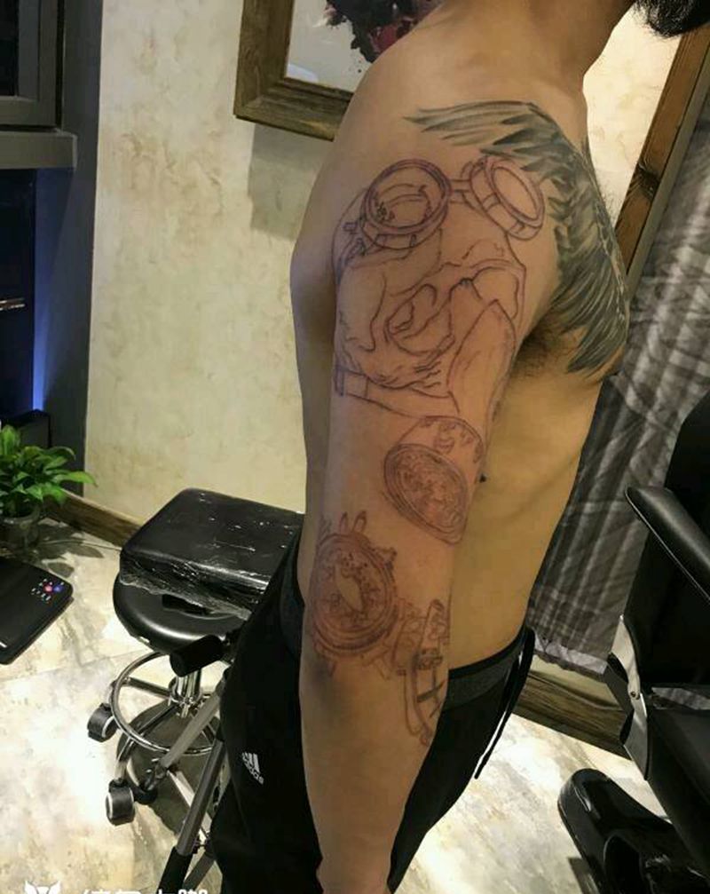 当前位置: 首页 >广西南宁市纹身店-墨匠刺青纹身图案>蒸汽朋克纹身图片_手臂传统鬼神成品纹身图案