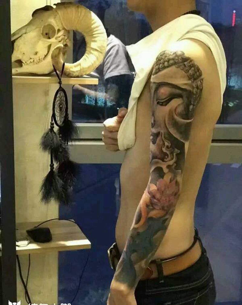 当前位置: 首页 >广西南宁市纹身店-墨匠刺青纹身图案>佛花臂纹身图片