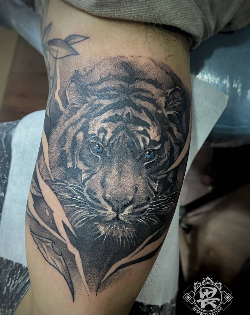 当前位置: 首页 >广东省揭阳市纹身店-畏·刺青RESPECT TATTOO纹身图案>#虎纹身图片_手臂欧美写实点刺纹身图案