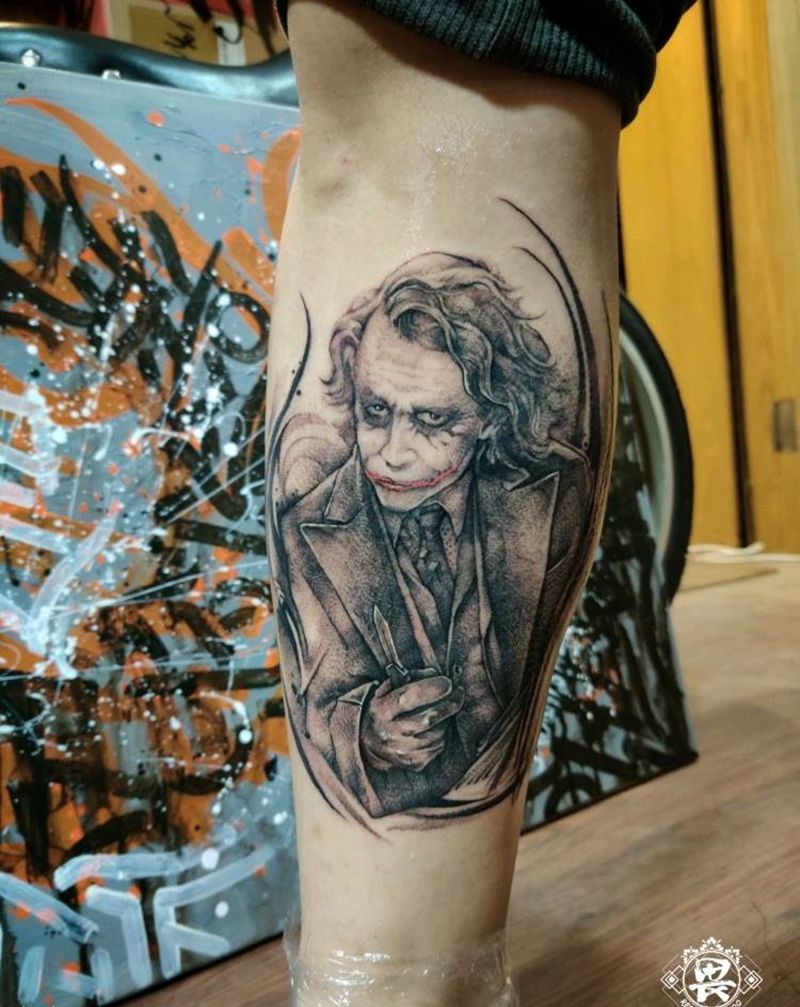 当前位置: 首页 >广东省揭阳市纹身店-畏·刺青RESPECT TATTOO纹身图案>JOKER纹身图片_腿部欧美写实纹身图案
