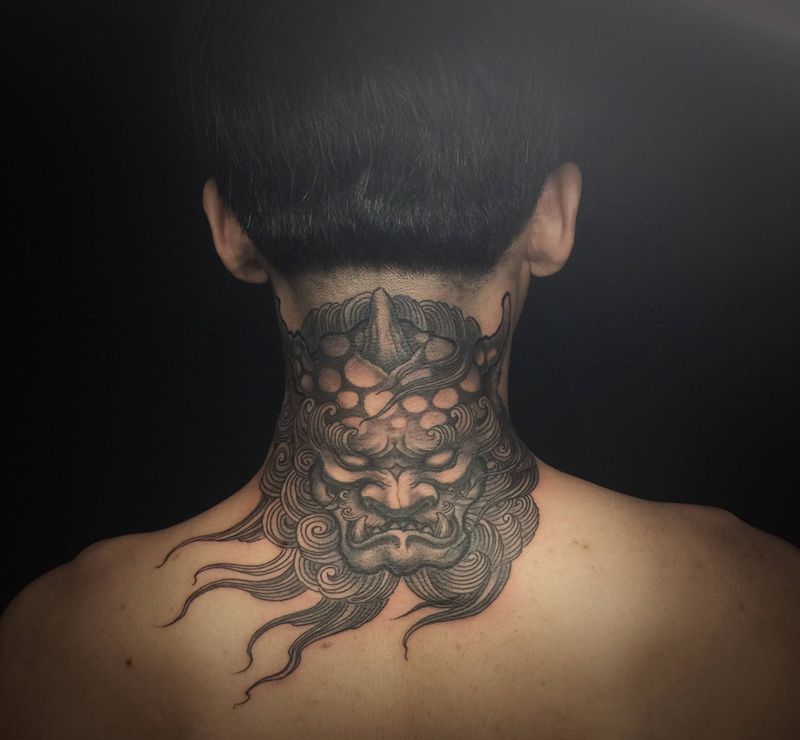 当前位置: 首页 >广西南宁市纹身店-红颜刺青工作室纹身图案>唐狮子纹身图片_颈部背部新传统纹身图案