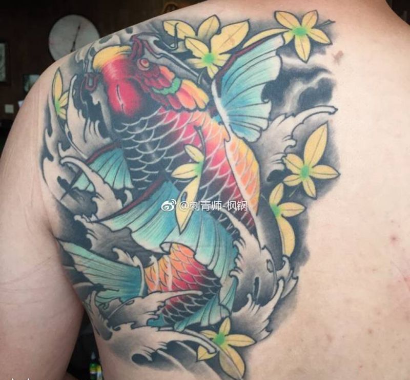 鲤鱼恢复一年多效果纹身图片_背部肩部新传统纹身图案