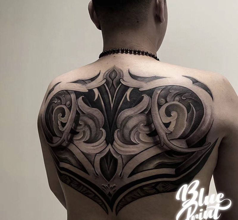 当前位置: 首页 >广西南宁市纹身店-BLUEPRINT蓝塗刺青工作室纹身图案>唐草半背纹身图片_背部几何图腾纹身图案