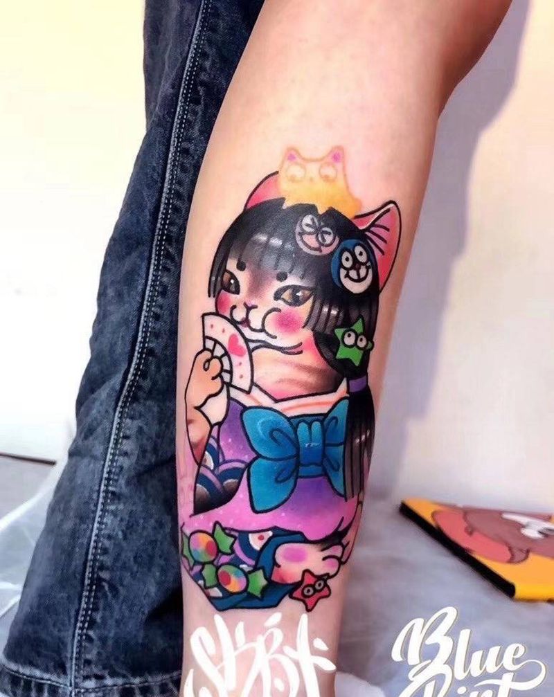 艺伎猫女纹身图片_腿部Old School纹身图案