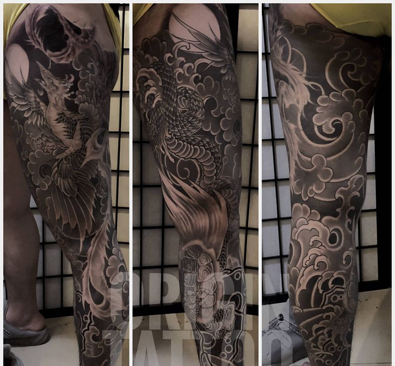 • T网红王老大花腿龙纹身图片_腿部新传统纹身图案