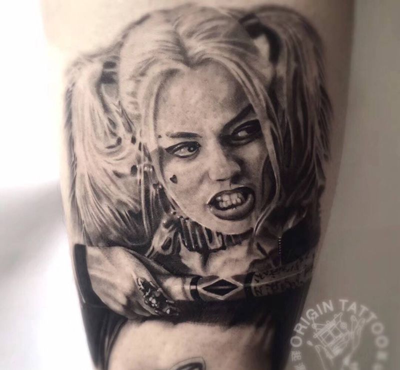 当前位置: 首页 >广西南宁市纹身店-BLUEPRINT蓝塗刺青工作室纹身图案>小丑女纹身图片_腿部欧美写实纹身图案