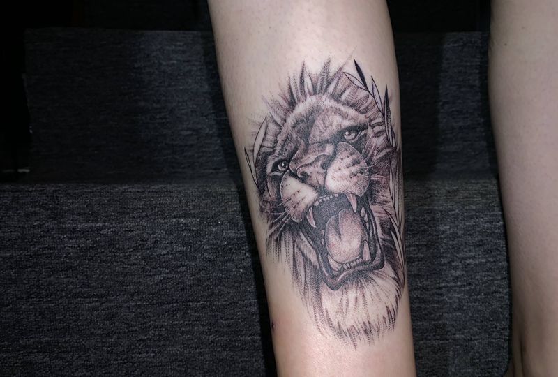 当前位置: 首页 >广西南宁市纹身店-墨徒纹身工作室纹身图案>狮子纹身图片_脚部欧美写实狮子纹身图案