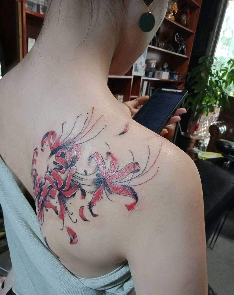 彼岸花纹身图片_肩部胸部水墨水彩彼岸花纹身图案