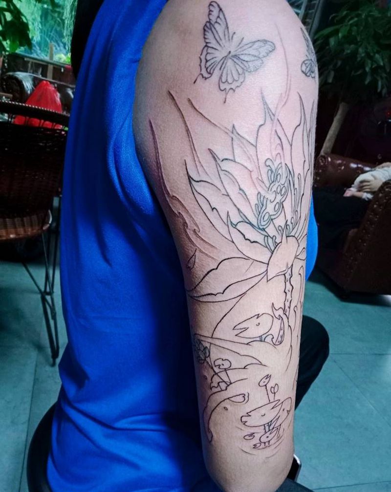 当前位置: 首页 >广西南宁市纹身店-墨徒纹身工作室纹身图案>荷花纹身图片_手部腿部新传统水彩莲花浪花蝴蝶纹身图案
